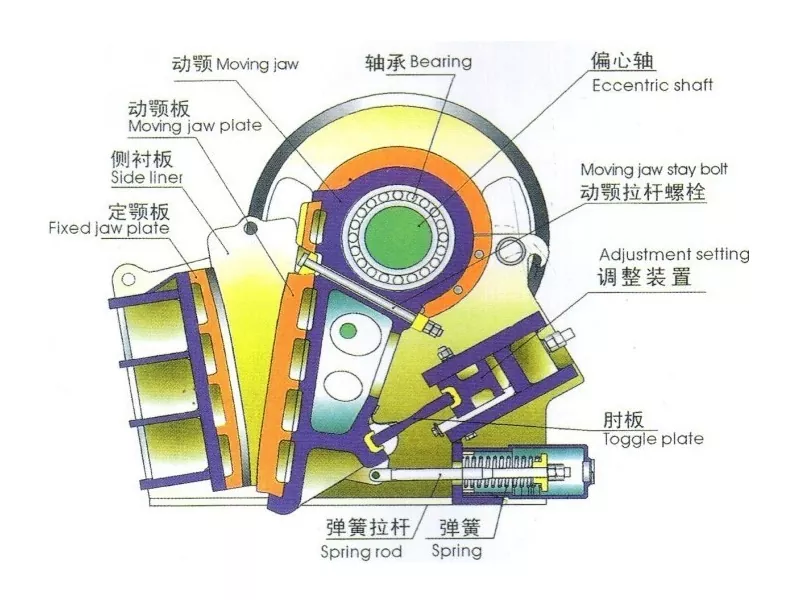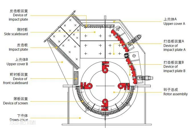 Strukturen er enkel og består av et foringsrør, en rotor og en påvirkningsplate. Den viktigste arbeidsdelen av Impact Crusher er en høyhastighets roterende rotor med en plathammer. Under den gjengjeldende påvirkningsprosessen kolliderer materialblokkene også med hverandre. Når materialet blir rammet av plathammeren, genereres påvirkningen av påvirkningsplaten og kollisjonen mellom hverandre, sprekker og løsring kontinuerlig inne, noe som til slutt fører til knusing. Effektanordningen brukes til å motstå materialet som er truffet av plathammeren og rebound det ut. Hovedkomponenten er påvirkningsplaten, som er sveiset med stålplater. Det er slitasjebestandige foringer på dens påvirkningsoverflate, og noen bruker slagbarer eller ristplater.